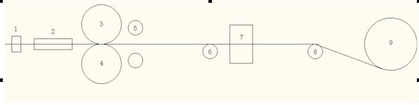 唐山市豐潤區(qū)玄龍鋼鐵有限公司鋁連鑄連軋機(jī)的主要工作是將經(jīng)原爐熔煉、靜止?fàn)t精煉后的高溫鋼液在快速冷卻的同時(shí)軋制成鋼板,最終通過卷取機(jī)卷成鋼卷。該設(shè)備主要有主軋機(jī)、鋼液位控制裝置、鈦絲進(jìn)給、鑄嘴小車、石墨噴涂及行走、平動(dòng)液壓剪、卷取機(jī)、卸卷車等,如圖所示。