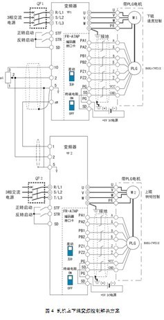 連軋機(jī)變頻器硬件接線圖如圖所示。VF1下輥?zhàn)冾l器的速度設(shè)定采用電位器,并連接了PLG差動(dòng)輸入信號(hào)作為閉環(huán)矢量控制的反饋信號(hào),跳線設(shè)置如圖4中標(biāo)識(shí)所示,同時(shí)輸出轉(zhuǎn)矩信號(hào)給VF2變頻器。VF2上輥?zhàn)冾l器采用轉(zhuǎn)矩控制,其轉(zhuǎn)矩命令來自于VF1的輸出,速度限幅來自于VF1的速度。