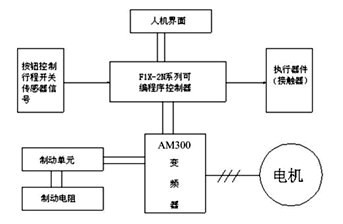 系統組成由人機界面,PLC,安邦信AMB300系列變頻器,制動單元,制動電阻。在整個系統中PLC和變頻器,觸摸屏均通過 RS-485 進行串行通訊。
