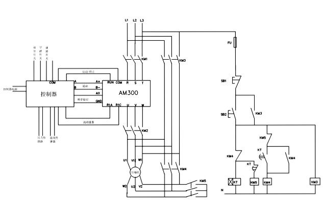 其中KM1、KM3為工變頻切換接觸器,控制器選用普勒特,變頻器選用安邦信AM300系列。變頻器與控制器的鏈接:R485通訊,開關量控制變頻器啟停,模擬信號控制變頻器速度,變頻器故障信號反饋等。